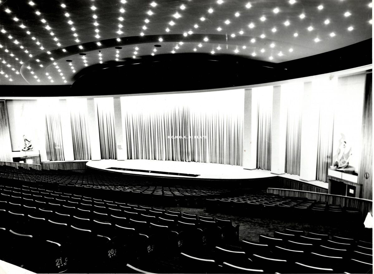 Formaat : 17 x 23 cm. - Het auditorium met aan weerszijden van het podium een keramieken beeld van Olivier Strebelle. Voorstellende Triton (rechts) en een zeemeermin (links)