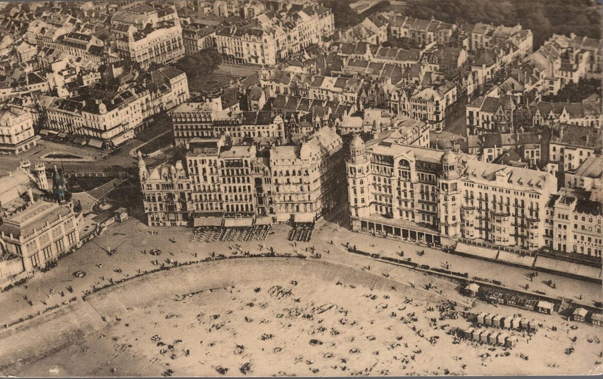 Nels, Ern. Thill, Bruxelles. - Ostende - Les Hôtels de la Digue pris en avion. Aeroplane view of the Hotels on the Esplanade. - Luchtopname. De Zeedijk en het Groot Strand nabij de westgevel van de derde Kursaal (links). Op de hoek met de Ijzerstraat, de hotels "Continental" (rechts) en "Helvetia"