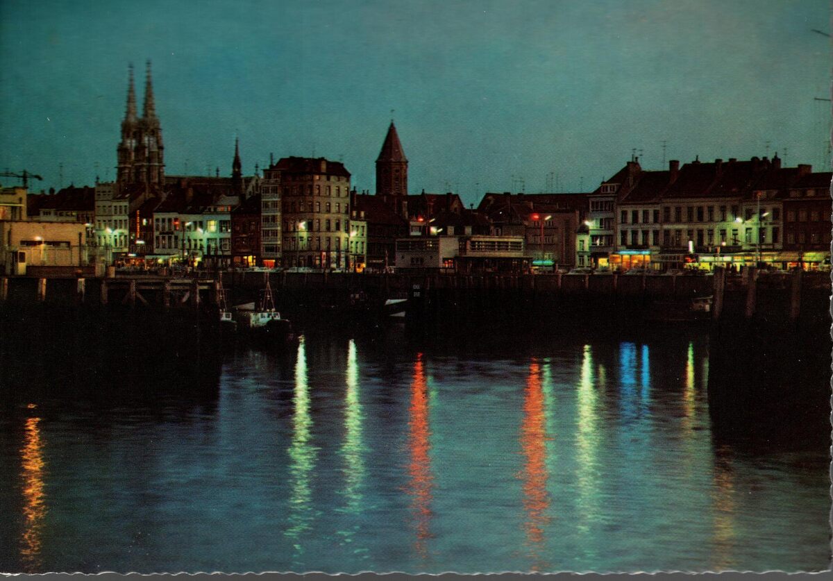 Kruger, N°933/112. - Oostende - Vissershaven en kaai bij nacht. - Nachtopname. Het Montgomerydok en op de achtergrond de Visserskaai. In het midden, de Sint Pieterstoren, genaamd de "Peperbusse" van de door brand vernielde Sint-Pieterskerk. Links, de torens van de Sint Petrus- en Pauluskerk.