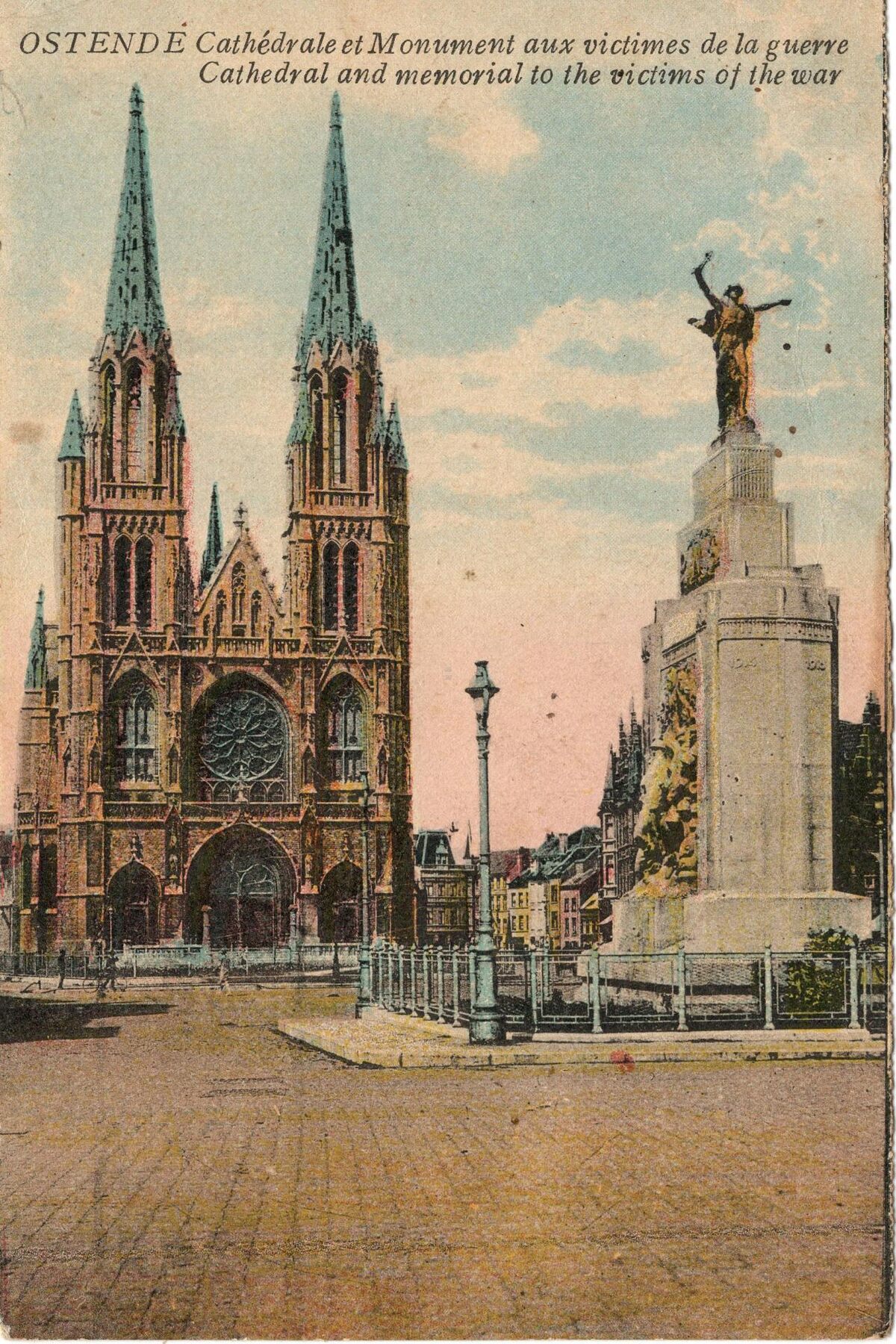 C.D. Ostende. - Ostende - Cathédrale et Monument aux victimes de la guerre. Cathedral and memorial to the victims of the war. - Bijgekleurde kaart. - Het Sint Petrus en Paulusplein. Vooraan, het oorlogsmonument voor de Oostendse militairen en burger slachtoffers van de Eerste Wereldoorlog. Achteraan, de Sint Petrus- en Pauluskerk