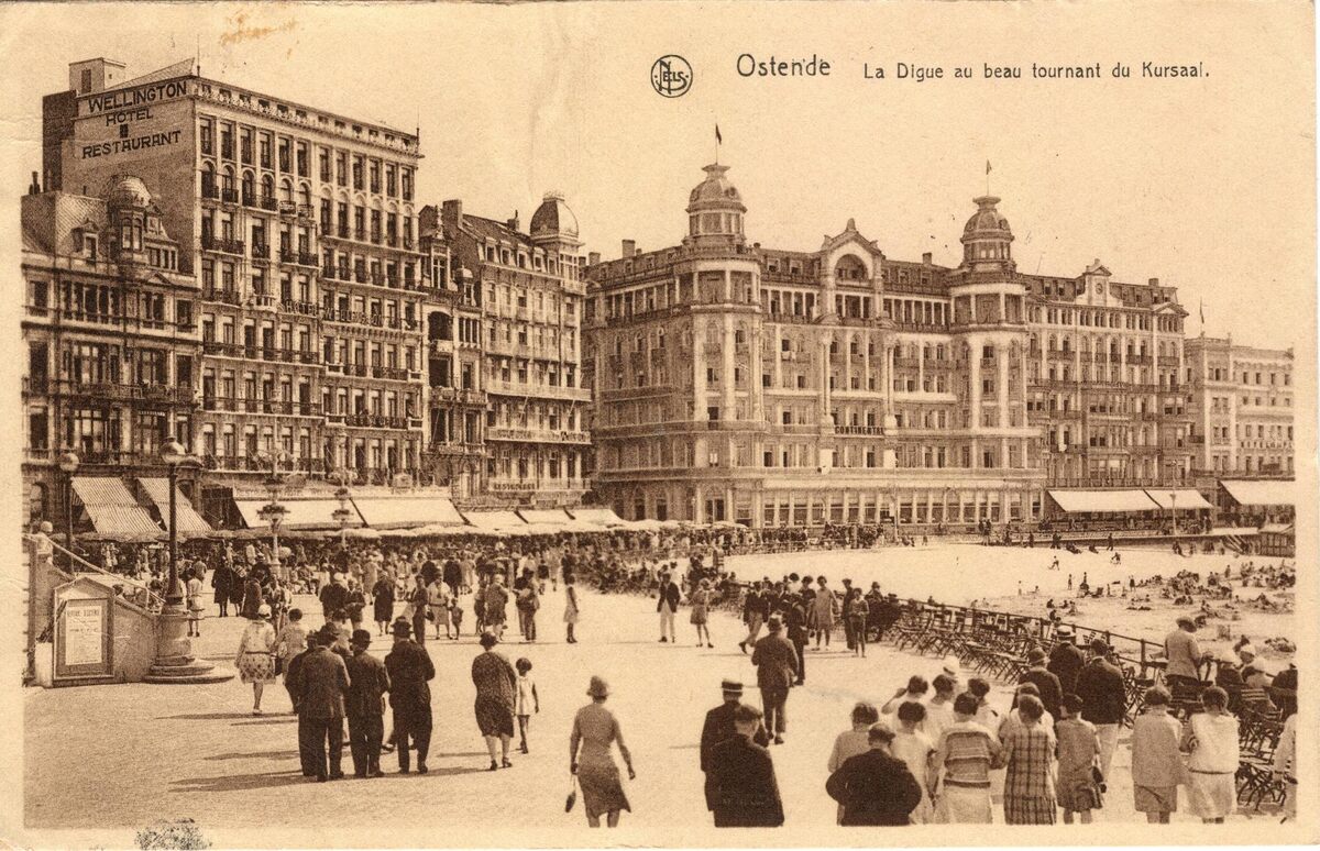 Nels. - Ostende - La Digue au beau tournant du Kursaal. - De Zeedijk nabij "Petit Nice". De grote hotels ten westen van de Kursaal. Het "Wellington Hotel" en op de hoek met de Ijzerstraat, "Hotel Continental"