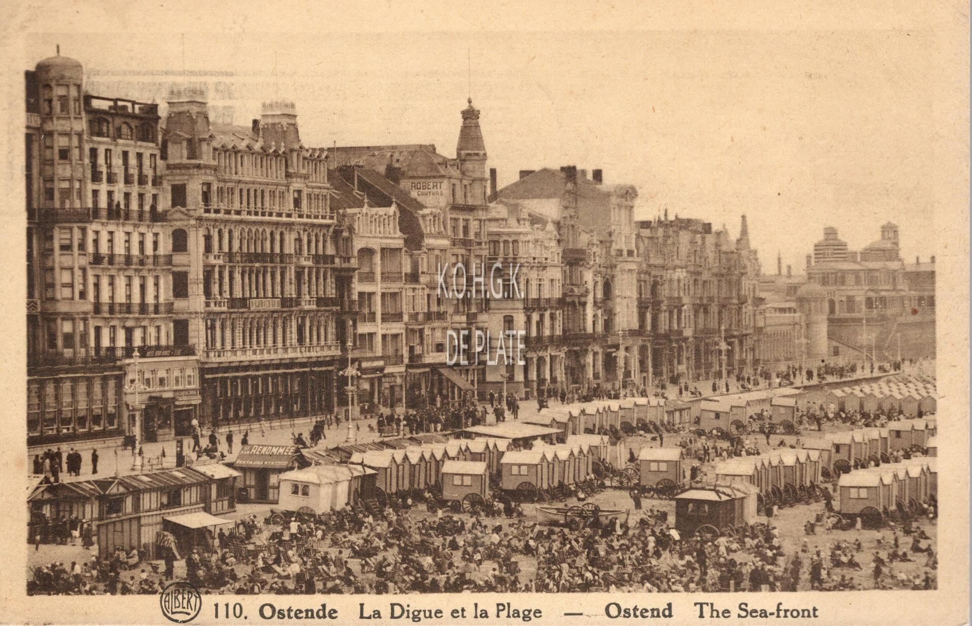 Albert, N° 110. - Ostende - La Digue et la Plage. Ostend - The Sea-front. - De Zeedijk gezien vanaf de Kursaal richting het Koninklijk Chalet. Strandrecreatie op het Groot Strand en de traditionele badkarren