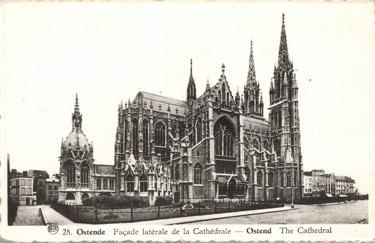 Postkaart Albert, N) 28. - Ostende - Façade latérale de la Cathédrale. Ostend - The Cathedral. - De Sint Petrus- en Pauluskerk, met links, de Koninginnekapel met het praalgraaf van Louis-Marie van Orléans, de eerste koningin van België. Foto vanuit de Jozef II-straat
