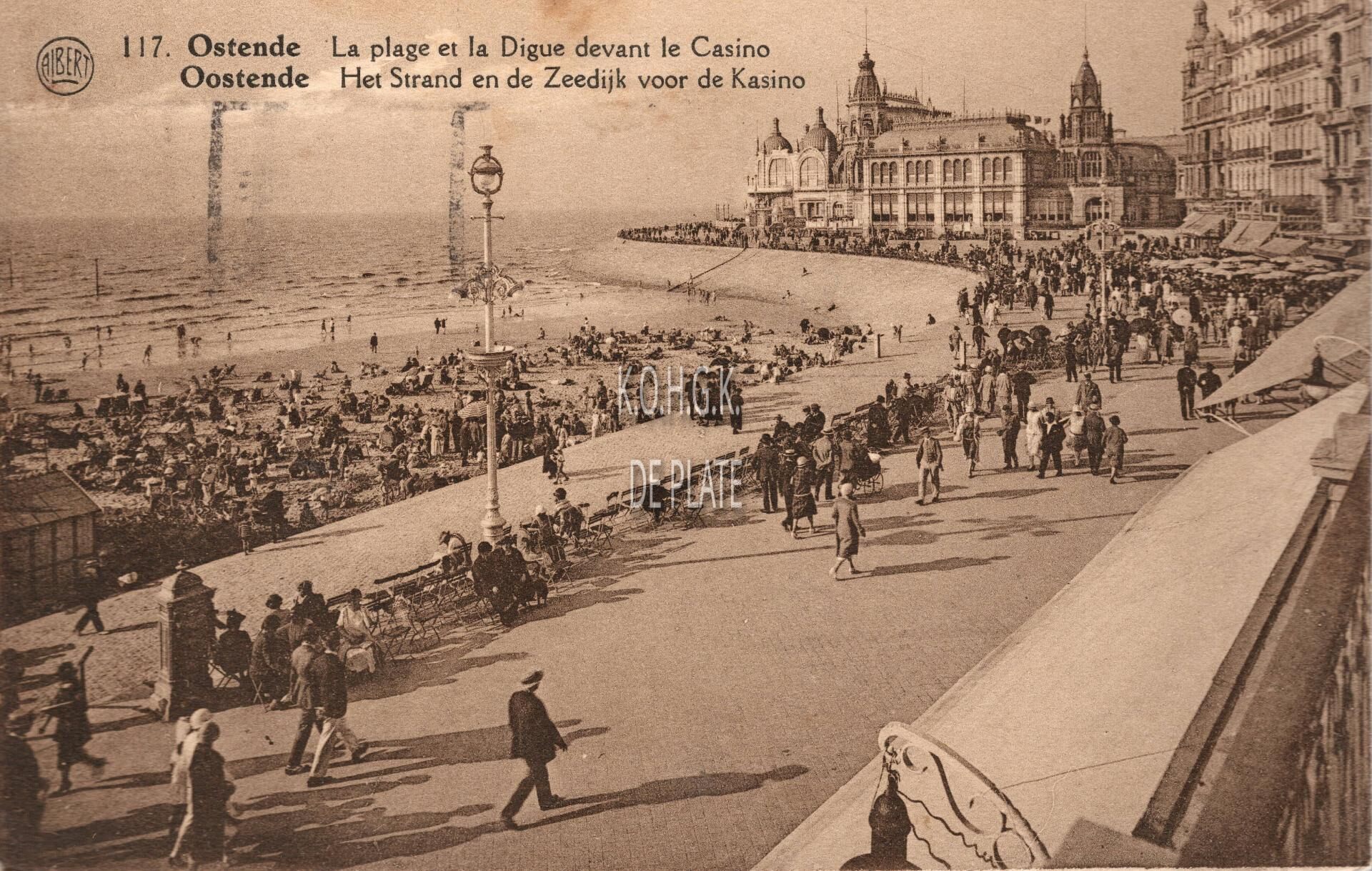 Albert, N° 117. - Ostende - La plage et la Digue devant le Casino. Oostende - Het Strand en de Zeedijk voor de Kasino. - De Zeedijk nabij de westgevel van de derde Kursaal. Strandrecreatie op het Groot Strand. Een zonnige namiddag in het interbellum