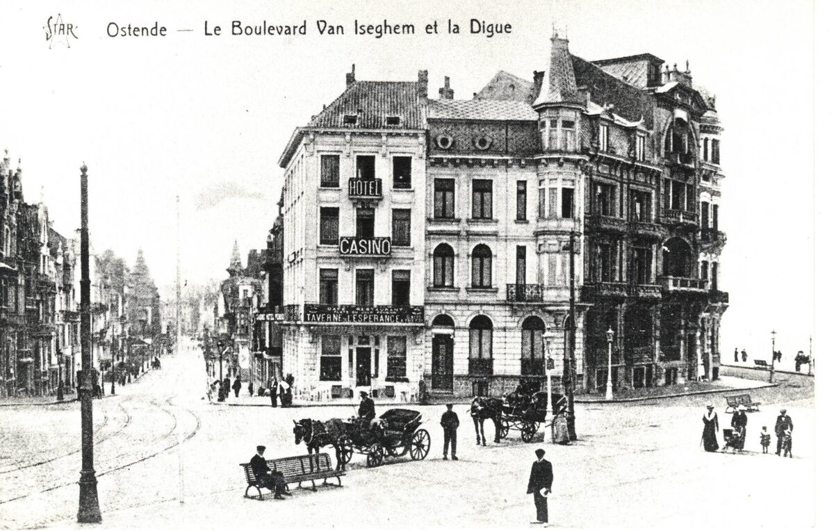 Afdruk van postkaart Star, formaat : 9 x 14 cm. - Ostende - Le Boulevard Van Iseghem et la Digue. - Het Hotel du Casino, Van Iseghemlaan 1 en de hoek met de Zeedijk (rechts). Koetsiers wachten op klanten.
