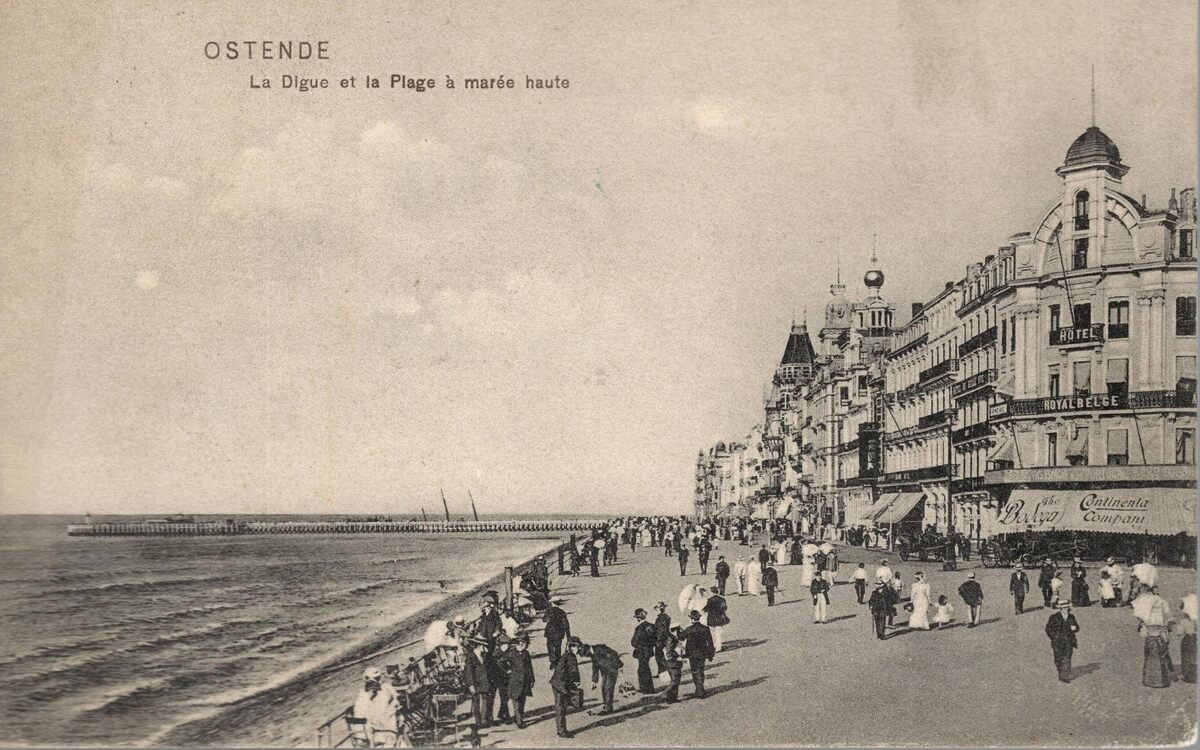 Dr. Trenkler Co, Bruxelles, Osd. 90. - Ostende - La Digue et la Plage à marée haute. - De Zeedijk ten oosten van de Kursaal, richting haven. Op de hoek met de Kursaal-Oosthelling, het "Hotel Royal Belge"
