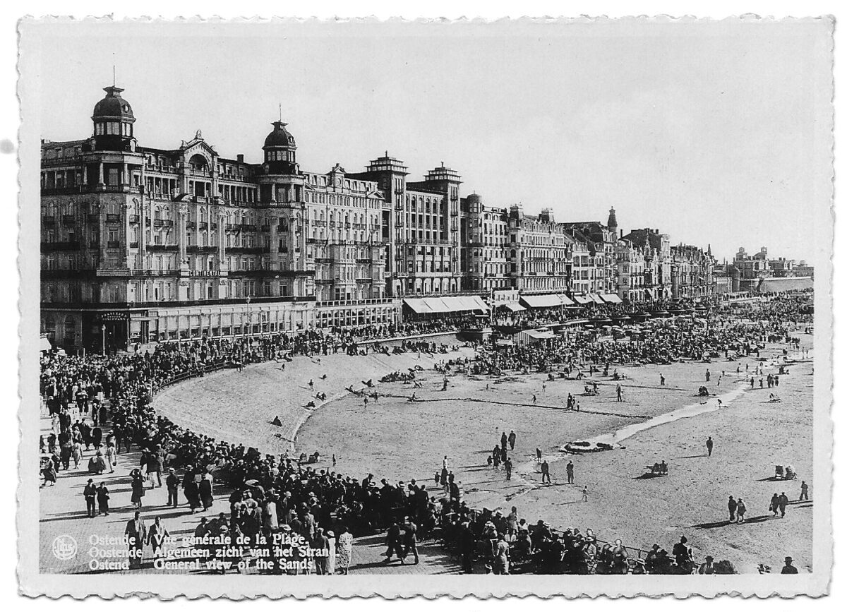 Nels Bromurite. - Ostende - Vue générale de la Plage. Oostende - Algemeen zicht van het Strand. Ostend - General view of the Sands. - Oostende in het interbellum. De Albert I-promenade ten westen van de Kursaal richting het Koninklijk Chalet.Veel volk op een zonnige namiddag. Strandrecreatie op het Groot Strand. Met de bouw van de badinstallaties (1934-1935) onder de dijk verdwijnen ook de traditionele badkarren. Vooraan, op de hoek met de Ijzerstraat, het grote hotel "Continental"