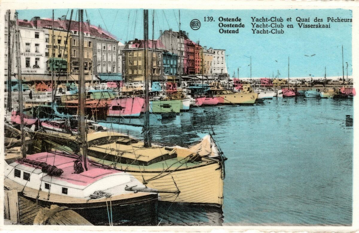 Albert, N° 139. - Ostende - Yacht-Club et Quai des Pêcherus. Oostende - Yacht-Club en Visserskaai. Ostend - Yacht-Club. - Bijgekleurde kaart. - Pleziervaartuigen en jachten in het Montgomerydok. Op de achtergrond, de Visserskaai met de talrijke restaurants.