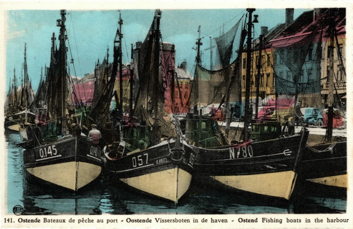 Albert, N° 141. - Ostende - Bateaux de pêche au port. Oostende - Vissersboten in de haven. Ostend - Fishing boats in the harbour. - Bijgekleurde kaart. - Uitleg : zie inventarisnummer 2015/0386