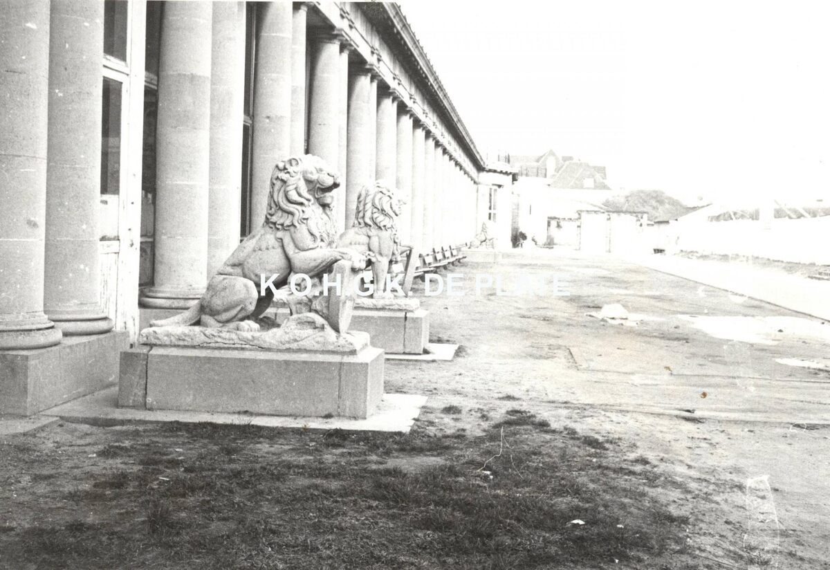 Formaat : 8 x 12 cm. - Schilddragende leeuwen uit zandsteen aan de zuidkant van de Koninklijke Gaanderijen. Geplaatst in 1916-1917, een tien jaar na de bouw van de Koninklijke Gaanderijen. Ze zijn het werk van de beeldhouwers Prosper Baeys en Georges Petit. Zie artikel van Norbert Hostyn in De Plate van januari 1984, p.7-8
