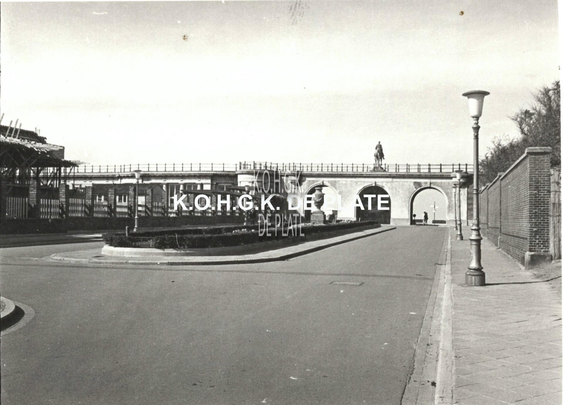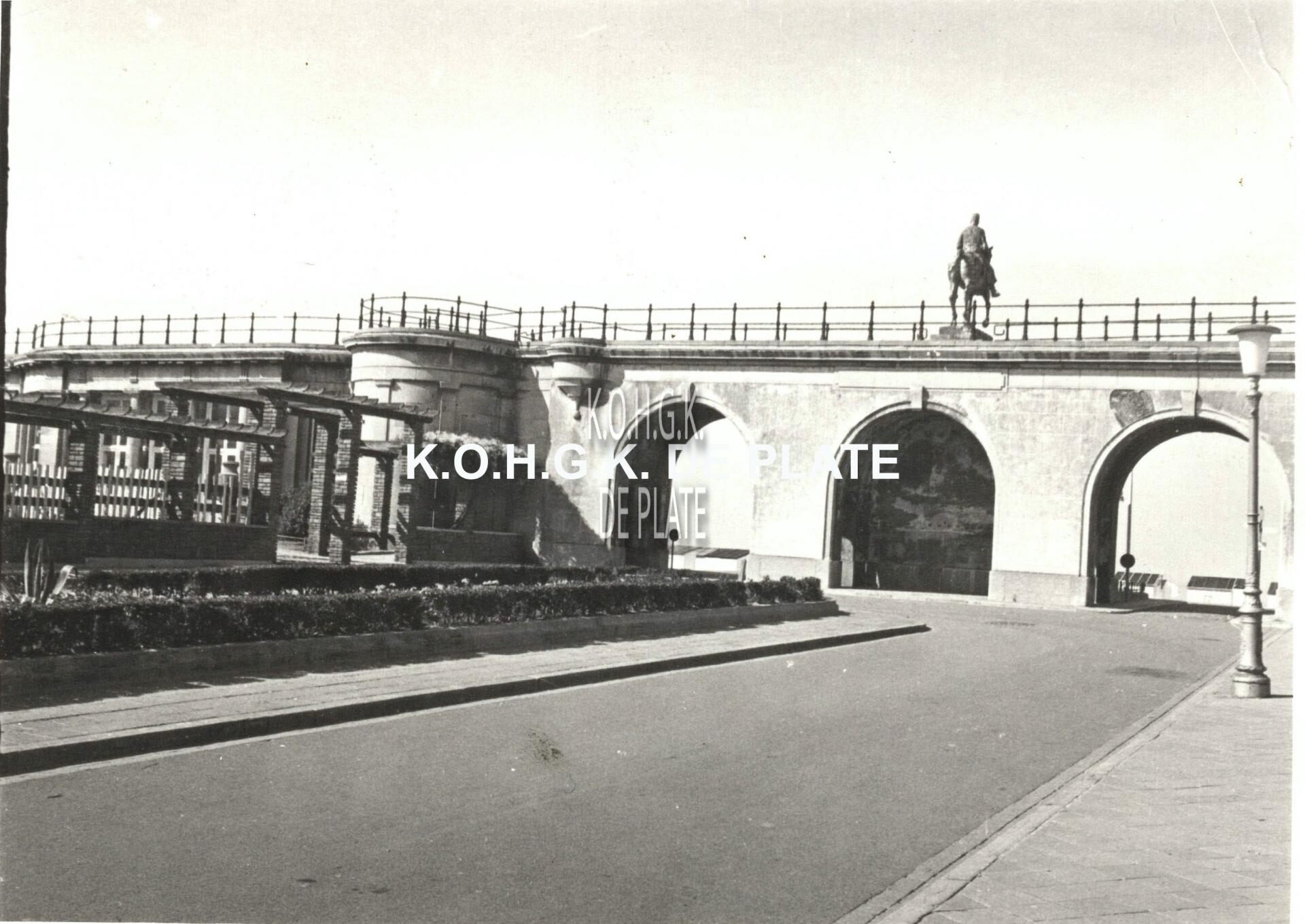 Formaat : 8 x 12 cm. - De "Drie Gapers" met het Leopold II-monument gezien vanuit de Koninginnelaan