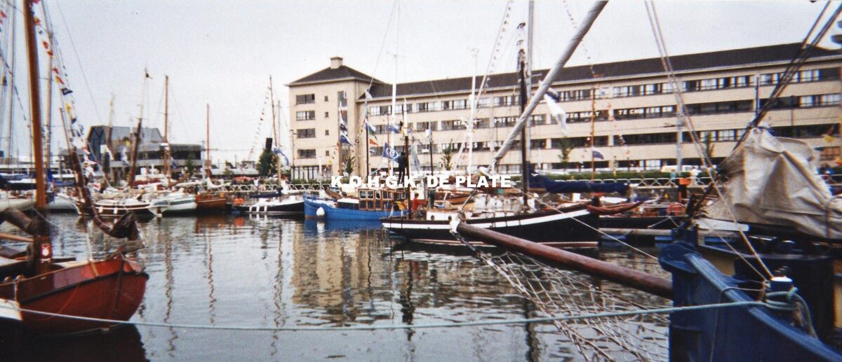 Formaat : 10 x 23 cm. - Zicht op het eerste handelsdok tijdens Oostendse voor Anker. Op de achtergrond, het Stedelijk Technisch Instituut voor Handel Industrie en Hotelwezen langs de Leopold III-laan. Links, het tramstation. Nu, 2022 afgebroken