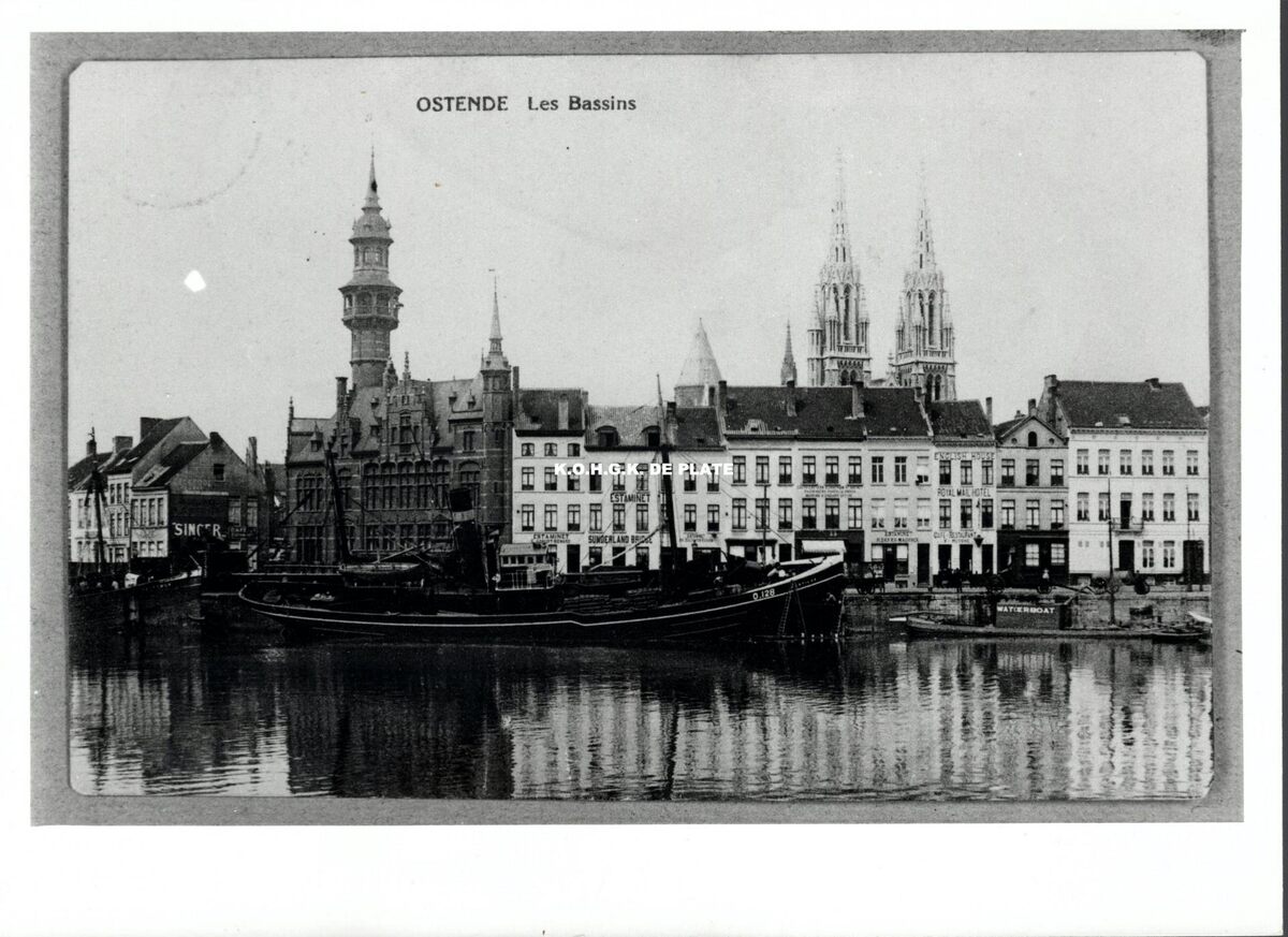 V.l.n.r. : Het Zeevaartcommissariaat ; Estaminet G. Comuyt-Benard : Estaminet Sunderland Bridge ; ? ; het reisagentschap South Eastern & Chatham Railways ; Estaminet Defer-Maurickx ; English House Royal Mail Hotel / Café Restaurant V. Huyghe ; ? ; ?. In de achtergrond de kerktorens van de Sint Petrus en Pauluskerk en de Peperbusse