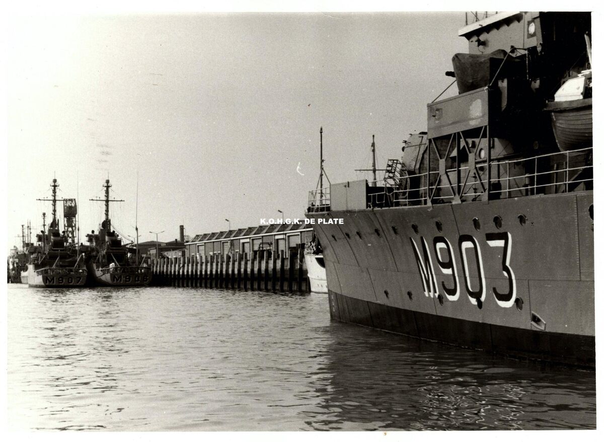 Formaat : 12,5 x 17,5 cm. - M.903 Dufour, M.906 Breydel en M.907 Artevelde in de haven nabij de werkhuizen van de Zeemacht op de Oosteroever.