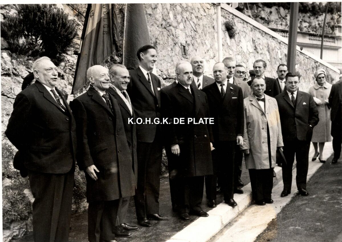 Formaat : 12 x 17 cm. - Oostendse delegatie in Monaco aan de Avenue d'Ostende. Op de foto zien we de heren Boudolf, Porta, Van Caillie, Piers, Prins Rainier, burgemeester van Monaco, Quagebeur (senior), Bonnel.