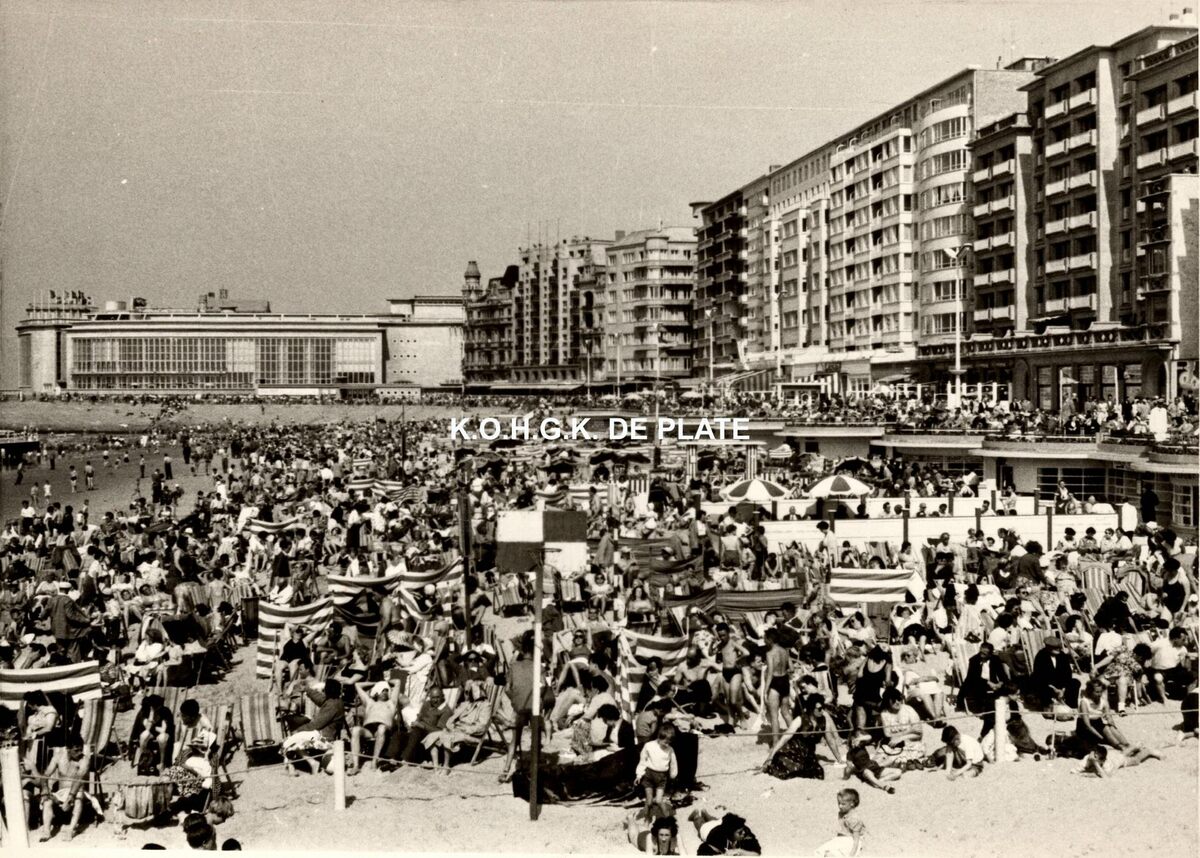 Formaat : 12 x 17 cm. - Groot Strand met spelende kinderen, zonnekloppers nabij de badinstallaties. In de achtergrond het kursaal en de hotels langs de Albert I-Promenade