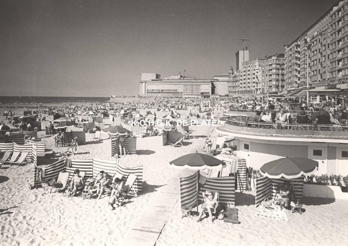 Formaat : 12,5 x 18 cm. - Zonnebaders op het Groot Strand nabij de badinstallaties. In de achtergrond het kursaal en de hotels langs de Albert I-Promenade