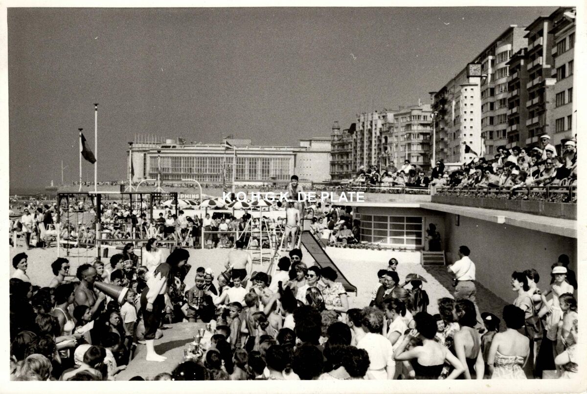 Formaat : 12 x 17 cm. - Toeristen op het Groot Strand nabij de badinstallaties. In de achtergrond het kursaal en de hotels langs de Albert I-Promenade