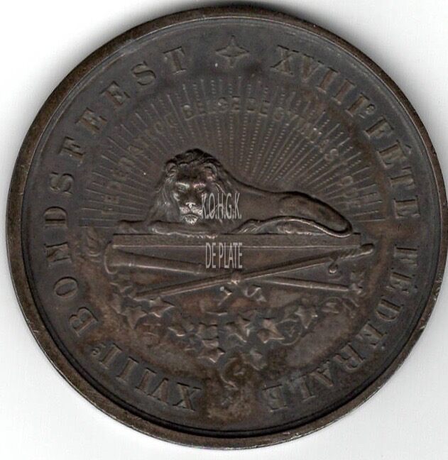 Op de keerzijde in de buitenrand rondom XVIIIe BONDSFEEST ✧ XVIIIe FETE FEDERALE. In de binnencirkel met sierrand, boven rondom FEDERATION BELGE DE GYMNASTIQUE, centraal een liggende leeuw met zonnestralen in de rug boven een hoorn gekruist met sabel, daar onder een klimop