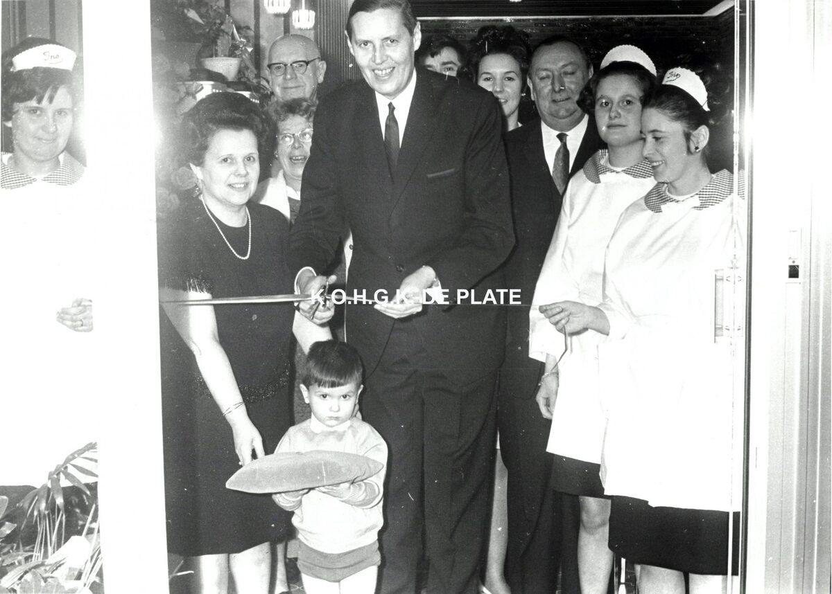 Formaat : 12 x 17 cm. - We zien burgemeester Jan Piers het lint doorknippen, met links en rechts de uitbaters en het personeel. Het jongetje vooraan draagt het kussen waarop de schaar lag.