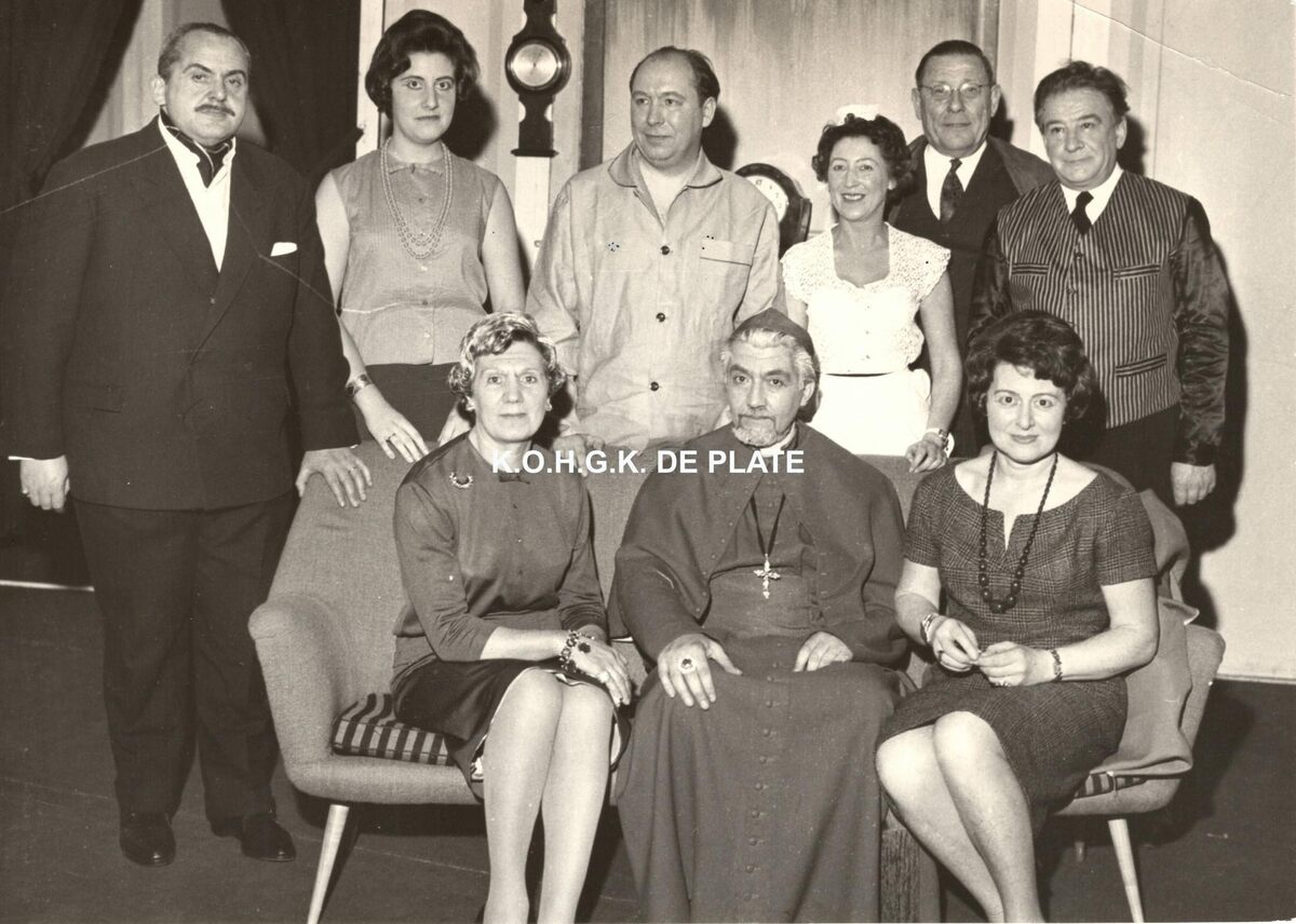 Formaat : 13 x 18 cm. - De toneelspelers van het Conservatoriumtoneel in het toneelstuk "Ik ben er... Ik blijf er" op 31 maart 1962. We zien Octaaf Defoor helemaal rechts op de tweede rij verkleed als butler