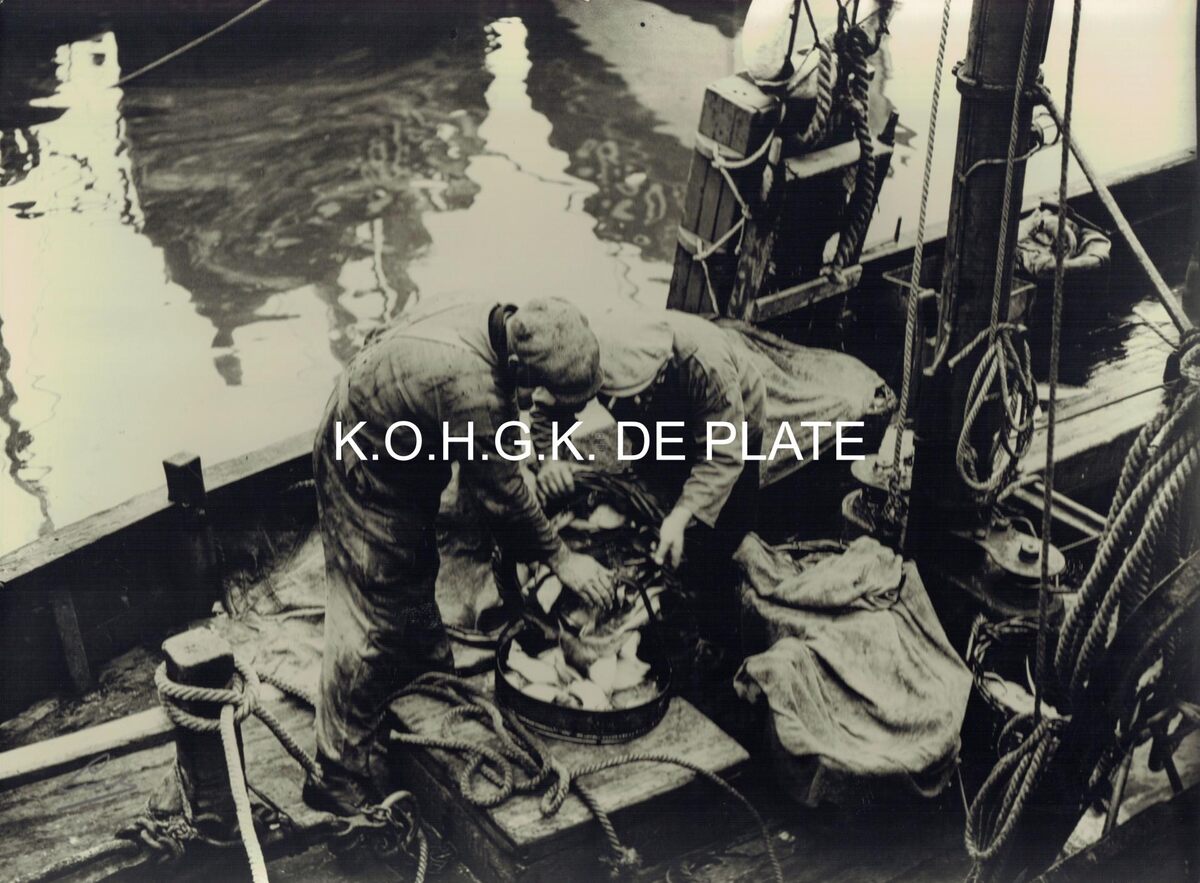 Vergroting. - Formaat : 30 x 40 cm. De visangels worden gevuld aan boord van het schip, klaar om te verkopen