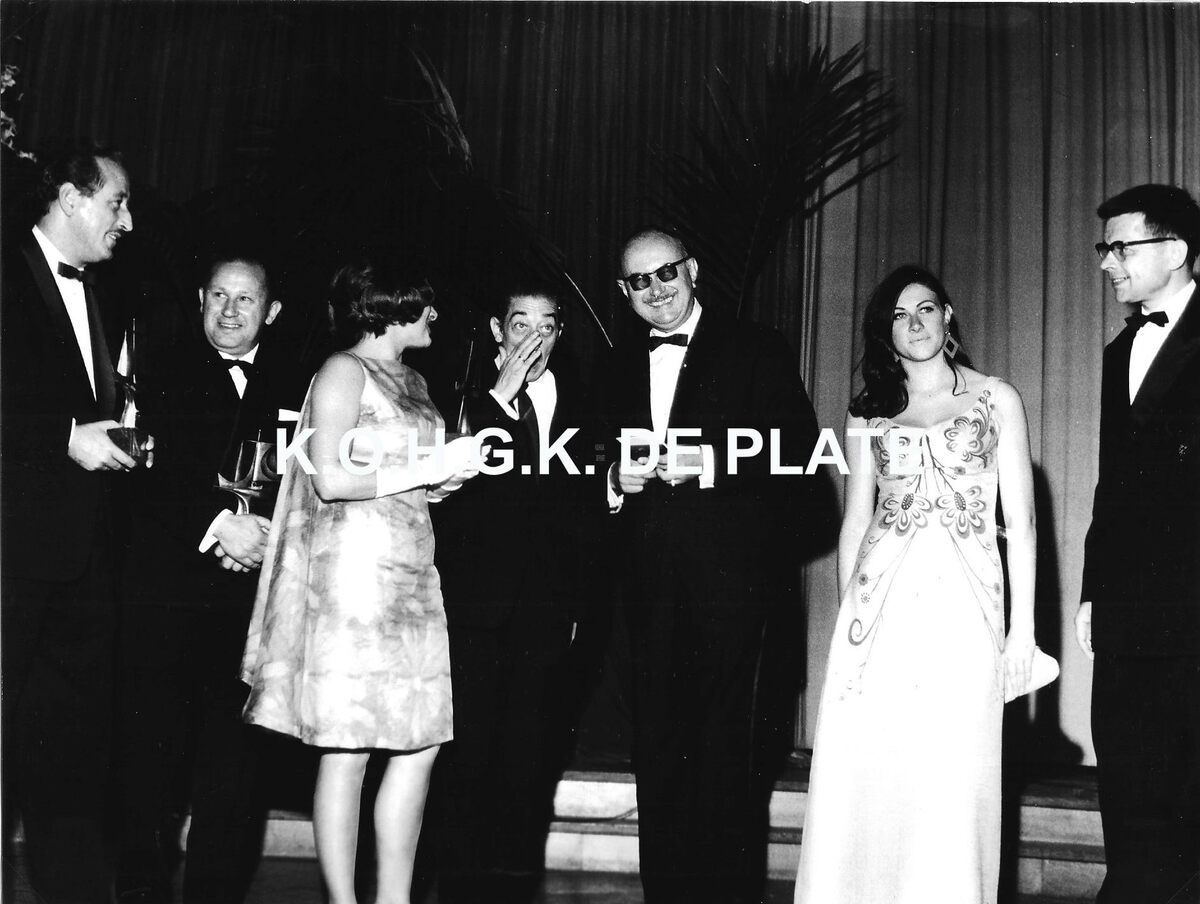 Formaat : 18 x 24 cm. - Persgala onder de patronage van de beroepsunie van de Belgische Pers. Uitreiking van de "Gouden, Zilveren en Bronzen Sloepen" geschonken door het Casino-Kursaal aan de meest verdienstelijke programma's van de Belgische Radio en Televisie. Derde van rechts, Roger De Ramée, directeur van de Kursaal en naast hem Jef Cassiers (?)
