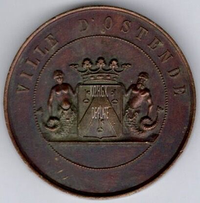 Op de voorzijde : rondom boven VILLE D’OSTENDE, centraal in een parelcirkel het gekroonde wapenschild met keper en drie sleutels van de stad Oostende, geflankeerd doortwee schildhouders, rechts door een meermin en links door een meerman beide in vooraanzicht