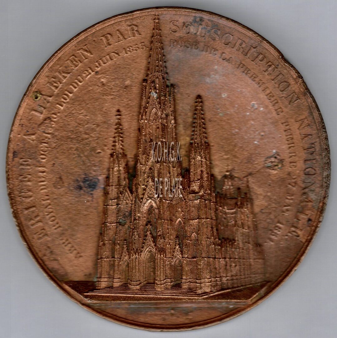 Op de keerzijde : horizontaal UNE EGLISE SERA ERIGEE / EN COMMEMORATION DE / SA MAJESTE LA REINE LOUISE / EN LA COMMUNE DE LAEKEN / ARRETE ROYAL DU 14 OCT 1850 / V. TESCH MIN. DE LA JUSTICE ET CH. ROGIER MIN. DE L’INT / LE PRODUIT DE LA SOUSCRIPTION NATIONAL / SERA AFFECTE A LA CONSTRUCTION / DE L’EGLISE DE LAEKEN / MONUMENT NATIONAL ELEVE A LA MEMOIRE DE LA REINE / DECISION DES DELEGUES DES PROVINCES DU 21 OCT 1850 / LE GOUVERNEMENT INTERVIENT DANS LES FRAIS / DE LA CONSTRUCTION DU MONUMENT / LOI DU 21 JUIN 1855 / F. PIERCOT MIN. DE L’INTERIEUR. CH. FALDER MIN. DE LA JUSTICE / LE 27 MAI 1854 SOUS LE REGNE DE LEOPOLD I / CH. FALDER MINISTRE DE LA JUSTICE / F. PIERCOT MINISTRE DE L’INTERIEUR / P. ANNEMANS GOUV. TEMPOR. DU BRABANT / CH.J. HERRY BOURGMESTRE DE LAEKEN / J.B. TORFS DESSERVANT / LA PREMIERE PIERRE DE L’EGLISE / BENISE PAR ENG. STERCKX / CARD. ARCHEV. DE MALINE / ET POSE PAR LE ROI