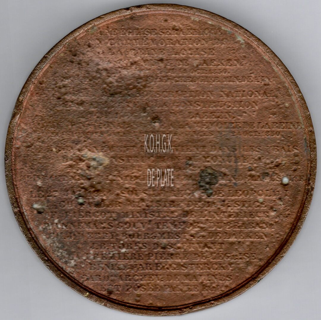 Op de voorzijde : rondom ERIGEE A LAKEN PAR SOUSCRIPTION NATIONALE, binnen rondom ARR. ROYAL DU 14 OCT 1850 – LOI DU 21 JUIN 1985 POSE DE LA PREMIERE PIERRE 27 MAI 1854