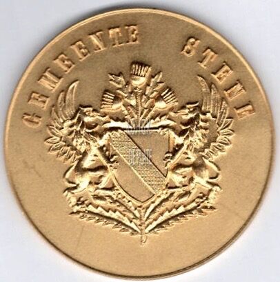 Op de voorzijde : rondom boven GEMEENTE STENE, centraal het wapenschild (blauwe keper op grijze achtergrond) geflankeerd door twee schildhouders (hier griffioenen) ,achter het schild een distel (symbool voor de polders)