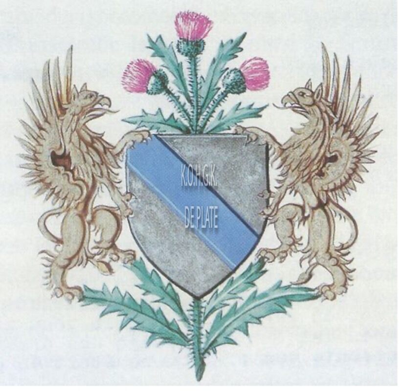 Beschrijving van het wapen : Van zilver met een keper van azuurblauw - het schild geplaatst op een distel van sinopel (soort groen) met purper bloemen en gehouden door twee griffioenen van goud.