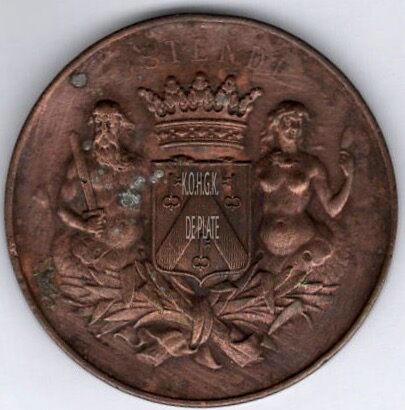 Op de voorzijde : centraal het gekroonde wapenschild met keper en drie sleutels van de stad Oostende, geflankeerd door twee schildhouders, links meerman met zwaard naar links kijkend, rechts meermin met handspiegel naar rechts kijkend, alles geplaatst op palmbladeren samengebonden met een lint, rondom boven OSTENDE