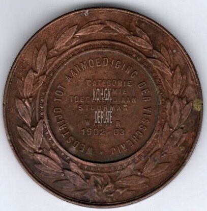 Op de keerzijde : rondom twee lauriertakken onderaan samen gestrikt, centraal een parelcirkel rond een binnen cirkel, in die cirkel rondom WEDSTRIJD TOT AANMOEDIGING DER VISSCHERIJ ✭, horizontaal CATEGORIE / PREMIE TOEGEKEND AAN / STUURMAN / ALEXIS PIETERS (in sierletters) / WINTER / 1902-03