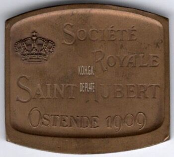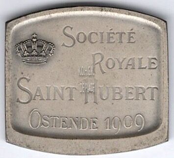 Op de keerzijde : linksboven een kroon, van boven naar onder SOCIETE / ROYALE / SAINT HUBERT / OSTENDE 1909