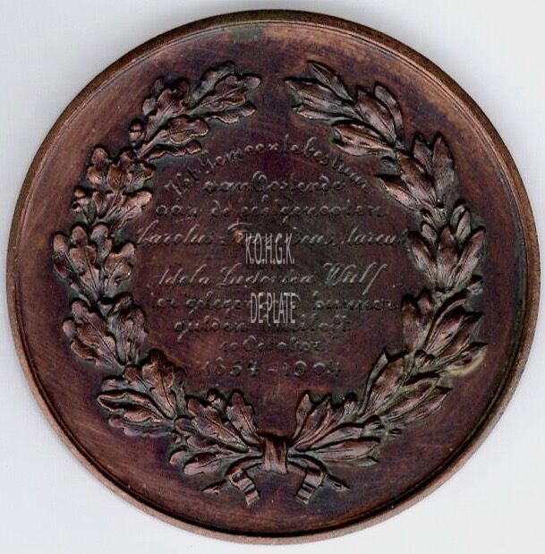 Op de keerzijde : rondom links een eikentak en rechts een lauriertak onderaan samen gestrikt, centraal rondom boven HET GEMEENTEBESTUUR, horizontaal VAN OOSTENDE / AAN DE ECHTEGENOOTEN / CAROLUS FRANCISCUS MARCUS / EN / ADELE LUDOVICA WULF / TER GELEGENHEID HUNNER / GOUDEN BRUILOFT / 10 OCTOBER / 1854-1904