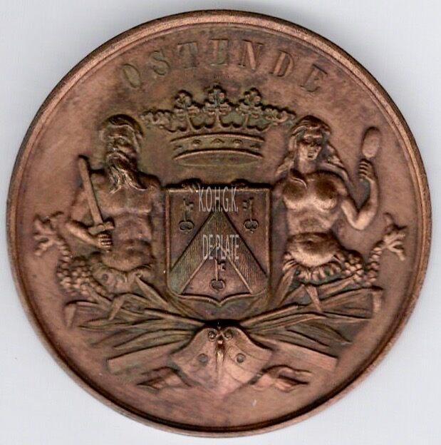 Op de voorzijde : centraal het gekroonde wapenschild met keper en drie sleutels van de stad Oostende, geflankeerd door twee schildhouders, links meerman met zwaard naar links kijkend, rechts meermin met handspiegel naar rechts kijkend, geplaatst boven een boeg op zee en gevuld met palmbladeren en twee gekruiste roeispanen , rondom boven OSTENDE