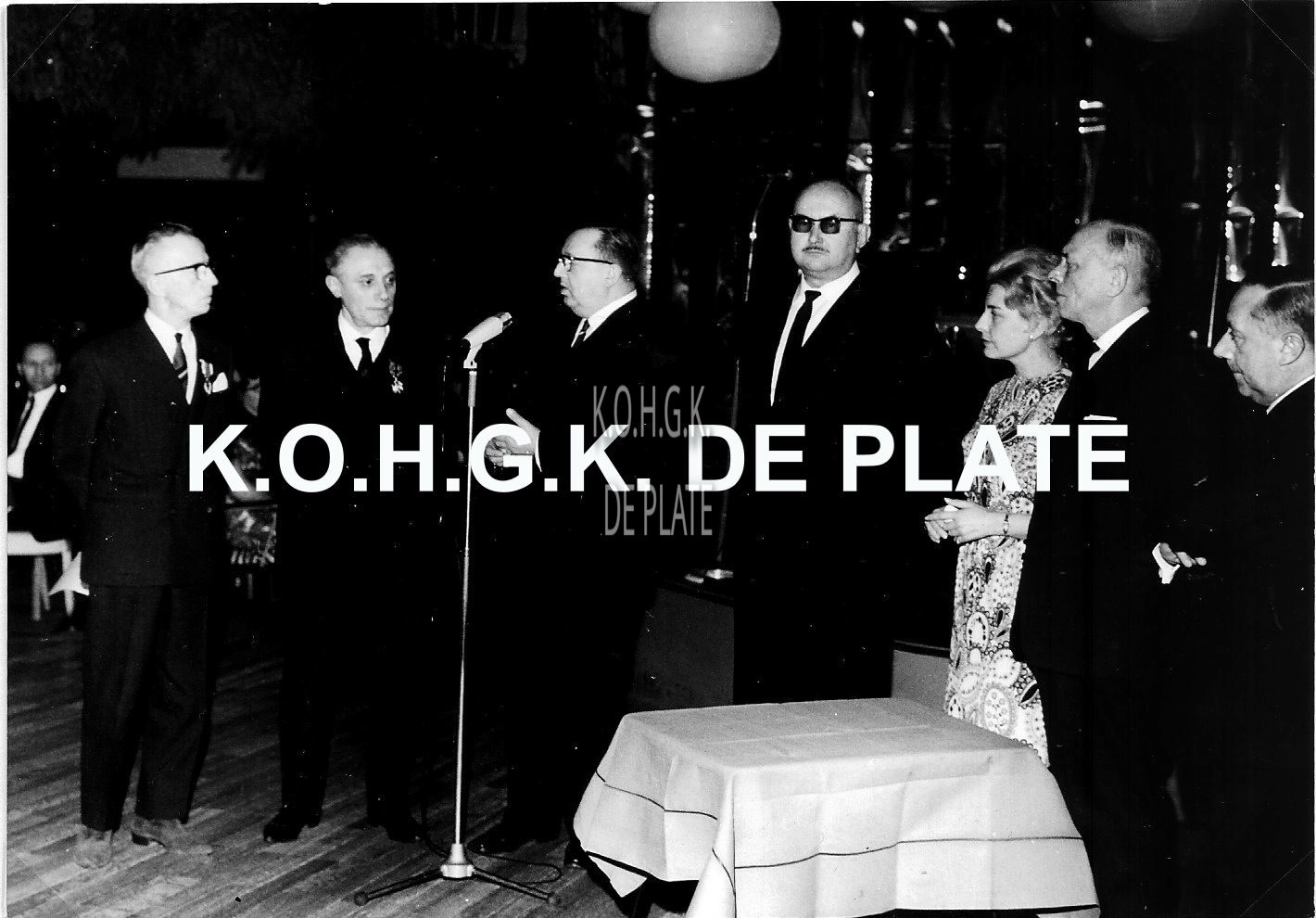 Formaat : 12,5 x 18 cm. - Waarnemend burgemeester John Lauwereins houdt zijn toespraak. Naast hem, Roger De Ramée, directeur van de kursaal en mevrouw Hélène Troupin, directrice personeel kursaal
