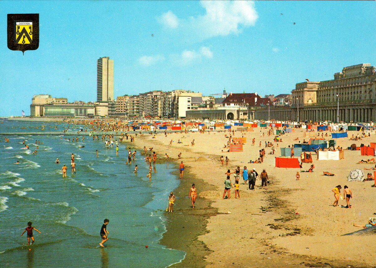 J.V.D.B./Fisa - Oostende - Strand en dijk - Plage et digue - Beach and promenade - Strand und Promenade. - Strandrecreatie op het groot strand. Rechts, de Koninklijke Gaanderijen en wat verder de Nieuwe Gaanderijen en de Koninklijke Villa. De appartementen langs de Albert I-promenade en de westgevel van de Kursaal. Altijd zichtbaar, de woontoren Europacentrum in de Van Iseghemlaan