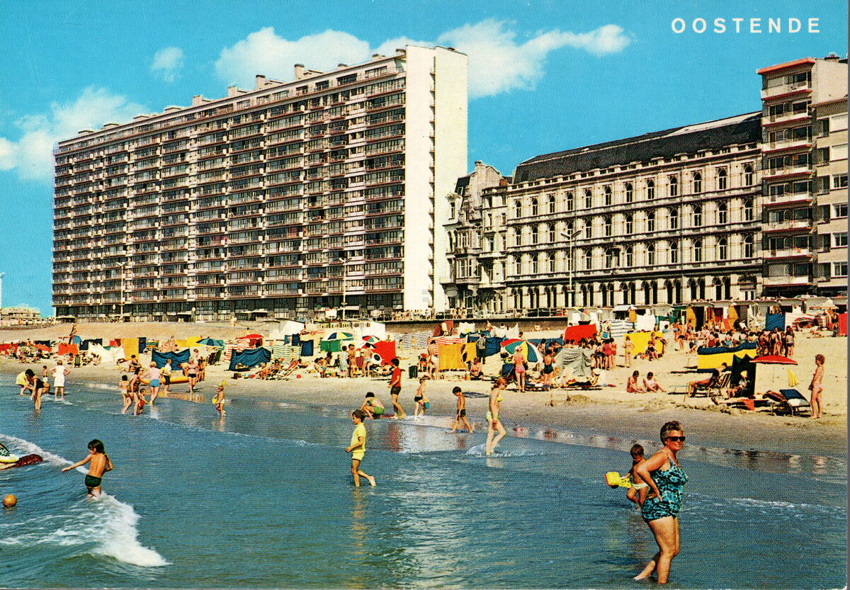 Strandrecreatie en pootjebaden op het strand van Mariakerke. Links, de Residentie Royal Palace en op de hoek met de 17 Oktoberstraat, het gebouw van het Institut des Dames du Sacré-Coeur, nadien Katholieke Industriële Hogeschool