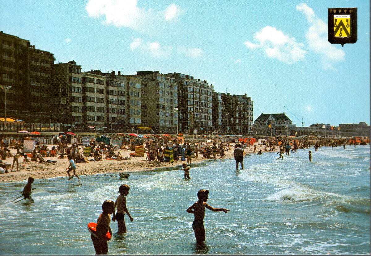 J.V.D.B./Fisa 102/23. - Oostende - Strand en dijk. Plage et digue. Beach and promenade. Strand und Promenade. - Strandrecreatie op het groot strand. Kinderen doen aan pootjebaden. De Albert I-promenade met rechts, de koninklijke villa nabij de Venetiaanse en Nieuwe gaanderijen