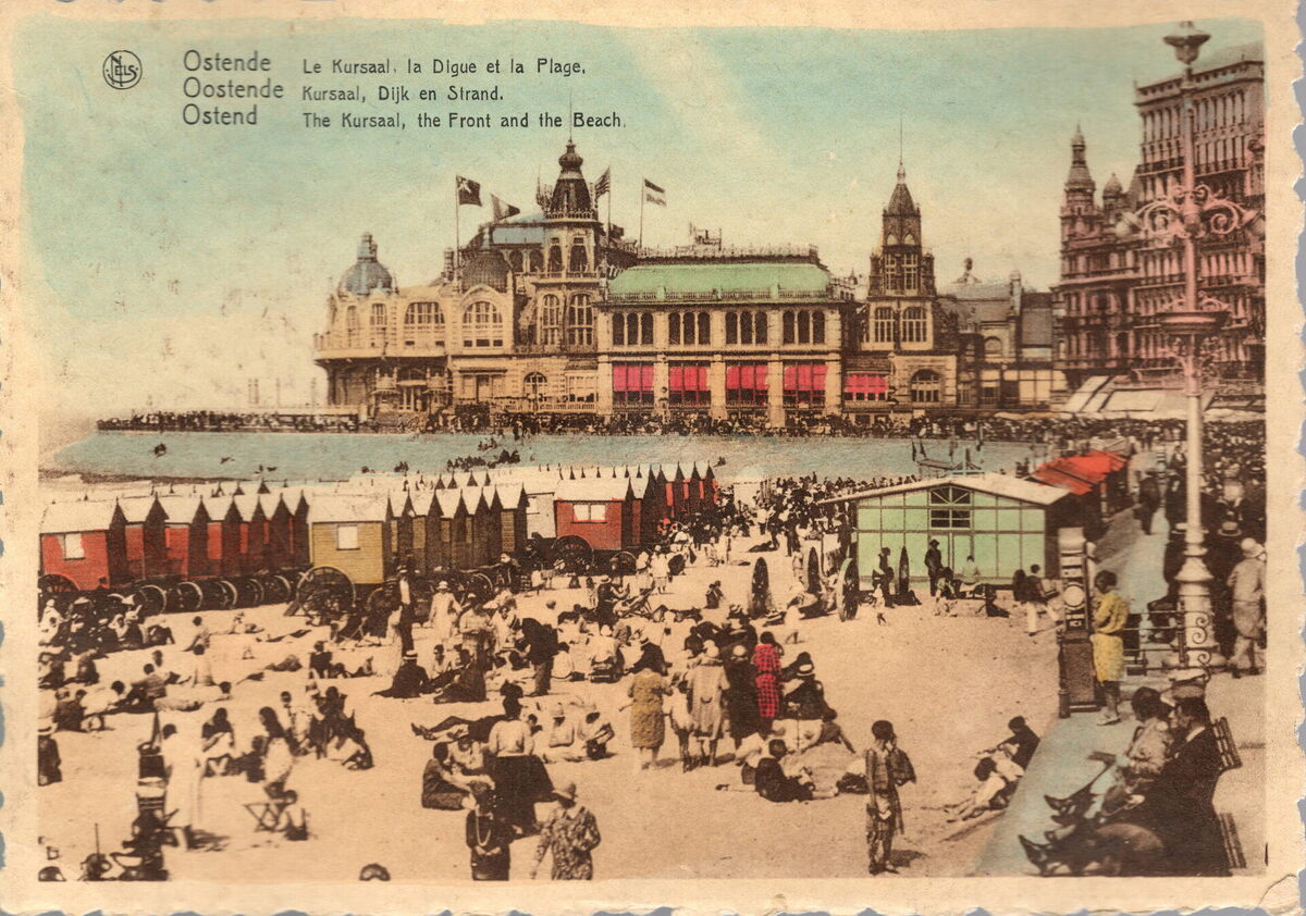 Nels. - OSTENDE Le Kursaal, la Digue et la Plage - OOSTENDE Kursaal, Dijk en Strand - OSTENDE The Kursaal, the Front and the Beach. - Bijgekleurde kaart.
