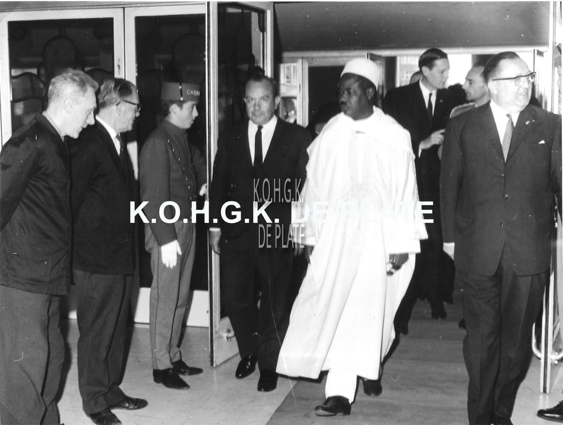 Formaat : 18 x 24 cm. - De president bij zijn aankomst.Links, drie personeelsleden van het casino-kursaal, Emilien Micheiels, directeur van de kursaal, de president van Kameroen, Jan Piers in gesprek en waarnemend burgemeester John Lauwereins