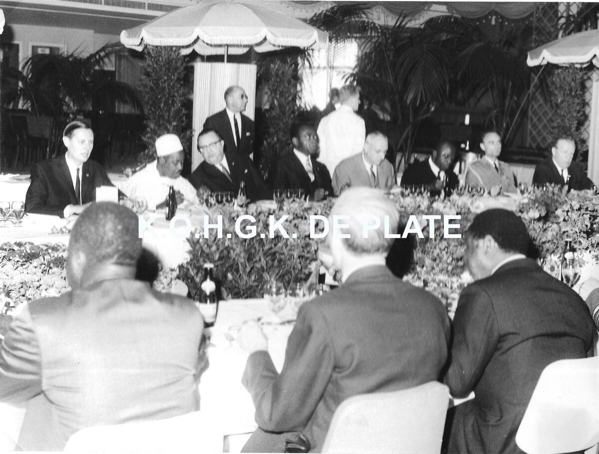 Formaat : 18 x 24 cm. - Banket aangeboden aan de president van Kameroen, met rechts van hem, John Lauwereins waarnemend burgemeester en links, Jan Piers ministerstaatssecretaris Openbaar Ambt en Toerisme