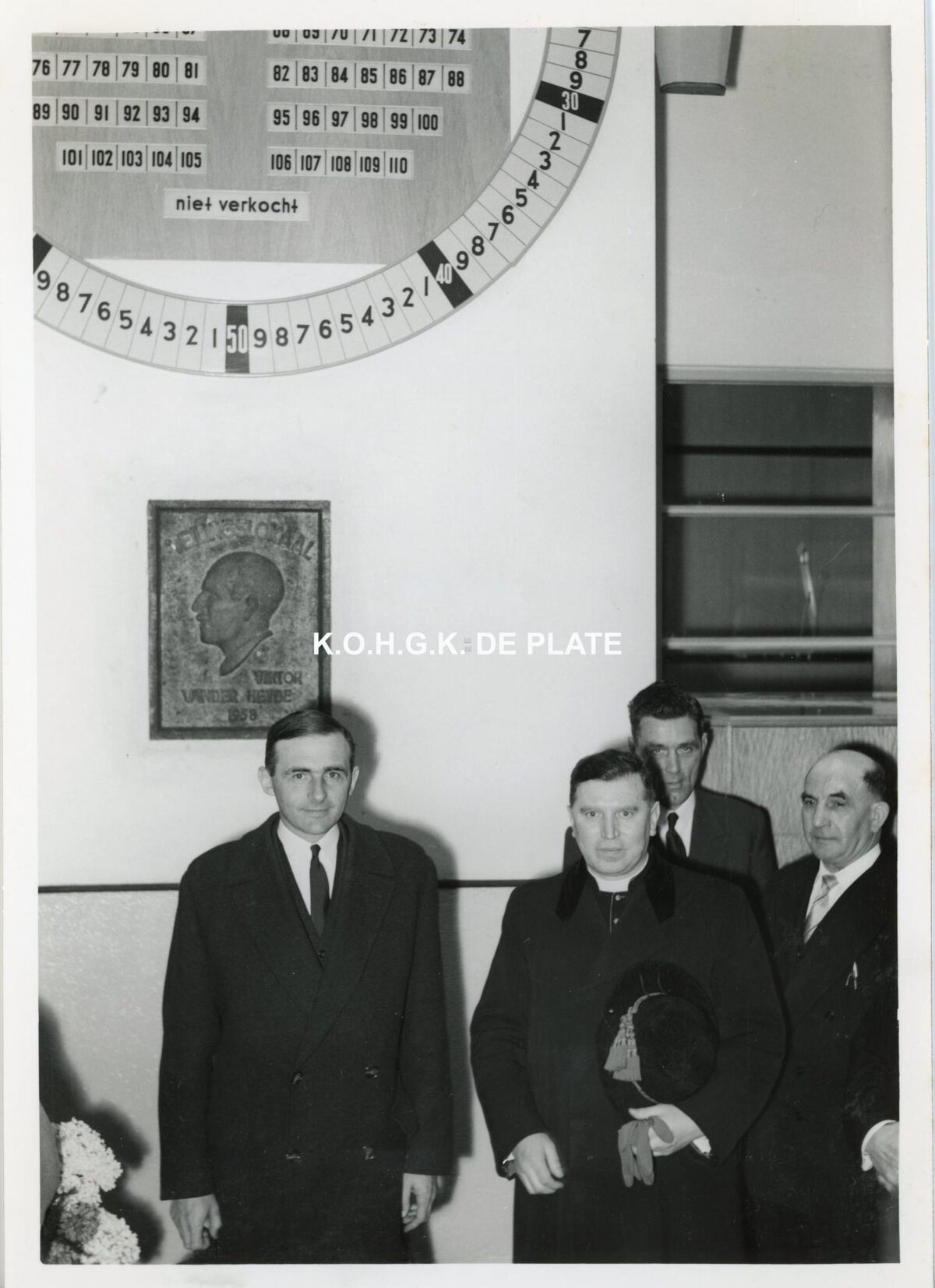 Formaat : 17 x 12 cm. - Gouverneur Van Outryve d’Ydewalle, hulpbisschop Alfred Vannest en Edmond Van Iseghemlaan bij de gedenkplaat en de automatische verkoopinstallatie
