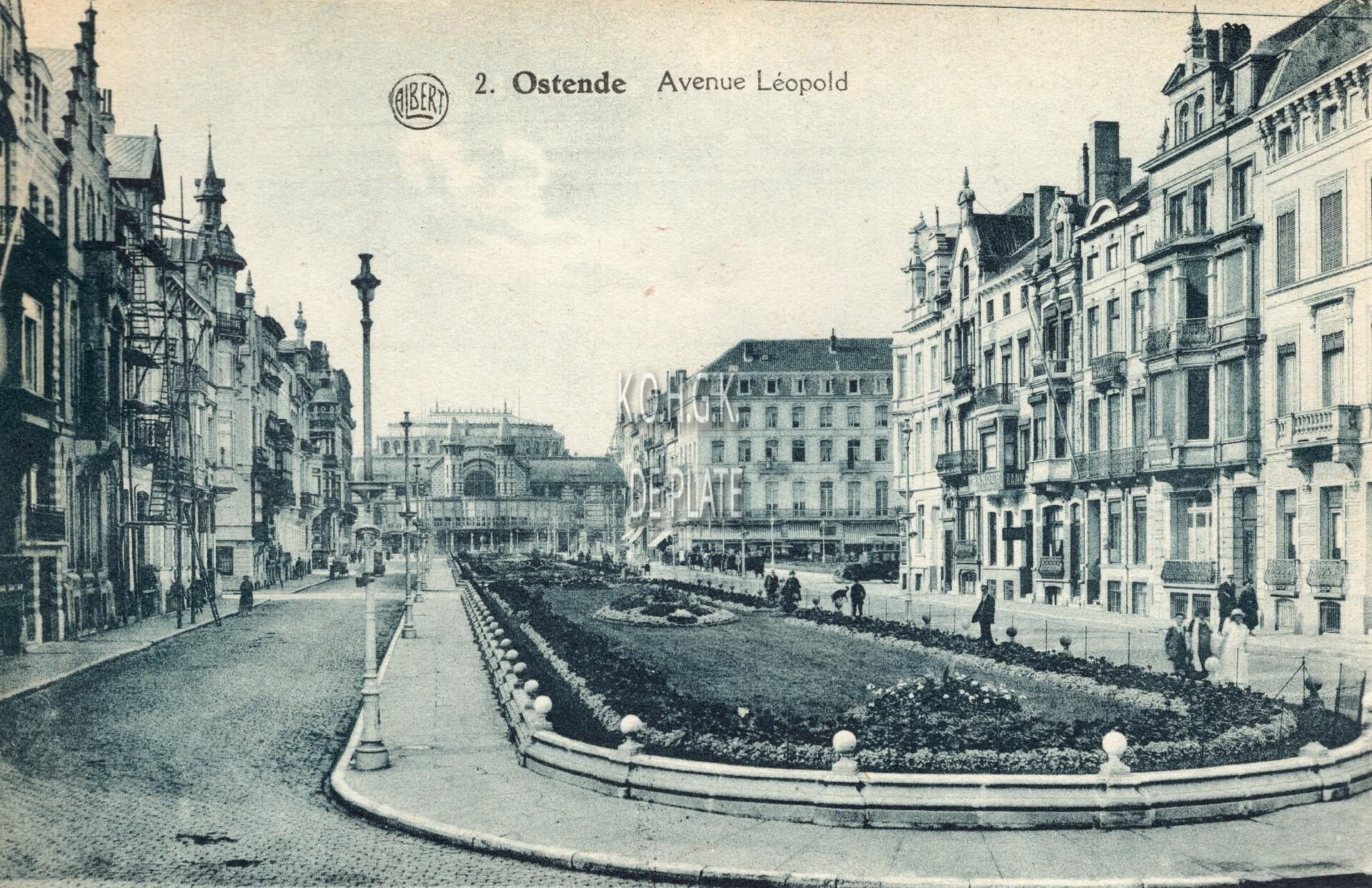 Albert, N° 2. - Ostende Avenue Léopold. - De Leopoldlaan gezien richting de hoofdingang van de kursaal. Let op de altijd verzorgde bloemenparken door de groendienst van de stad
