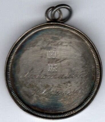 De gedenkpenning is rond met parelrand in een vatting met geprofileerde gladde rand met oog en ring, en is als volgt ingegraveerd :