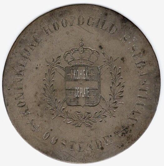 Op de voorzijde : centraal het embleem van de gilde, gekroond wapenschild geplaatst op twee gekruiste bogen met aan beide zijden een lauriertak onderaan samen gestrikt, rondom KONINKLIJK HOOFDGILD ST. SEBASTIAAN ↹ OOSTENDE ↹