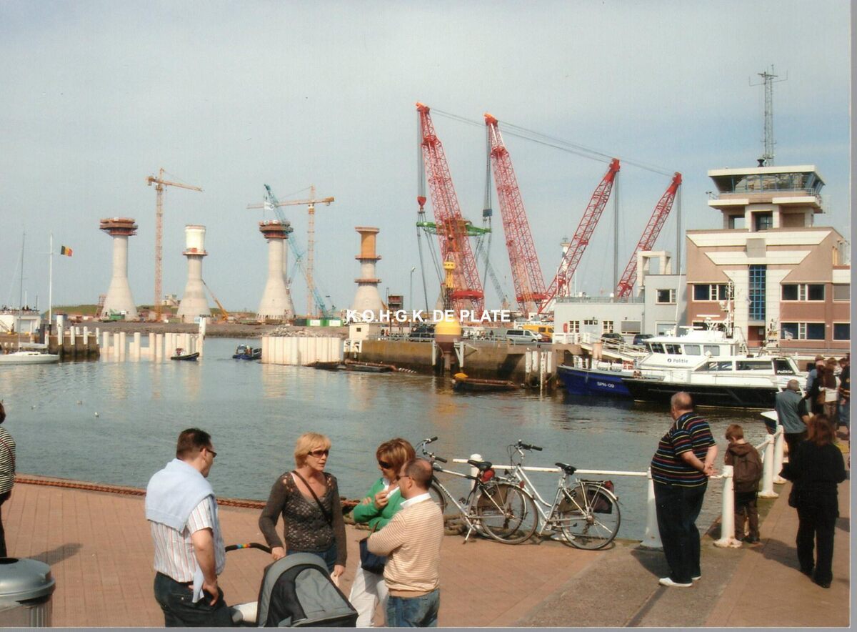 Formaat : 10 x 13,5 cm. - We zien op de oosteroever de bouw van de betonnen sokkels voor de windmolens. Vooraan, de Visserskaai en het Montgomerydok. Rechts, detail van het Zeewezengebouw.