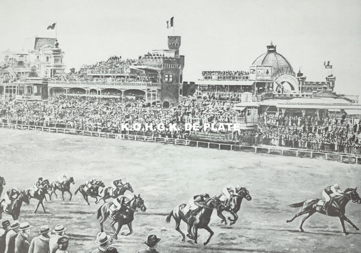Afdruk. - 29 x 42 cm. - Paardenkoers op de Wellingtonrenbaan. In de achtergrond rechts de ingang van het Royal Palace Hotel